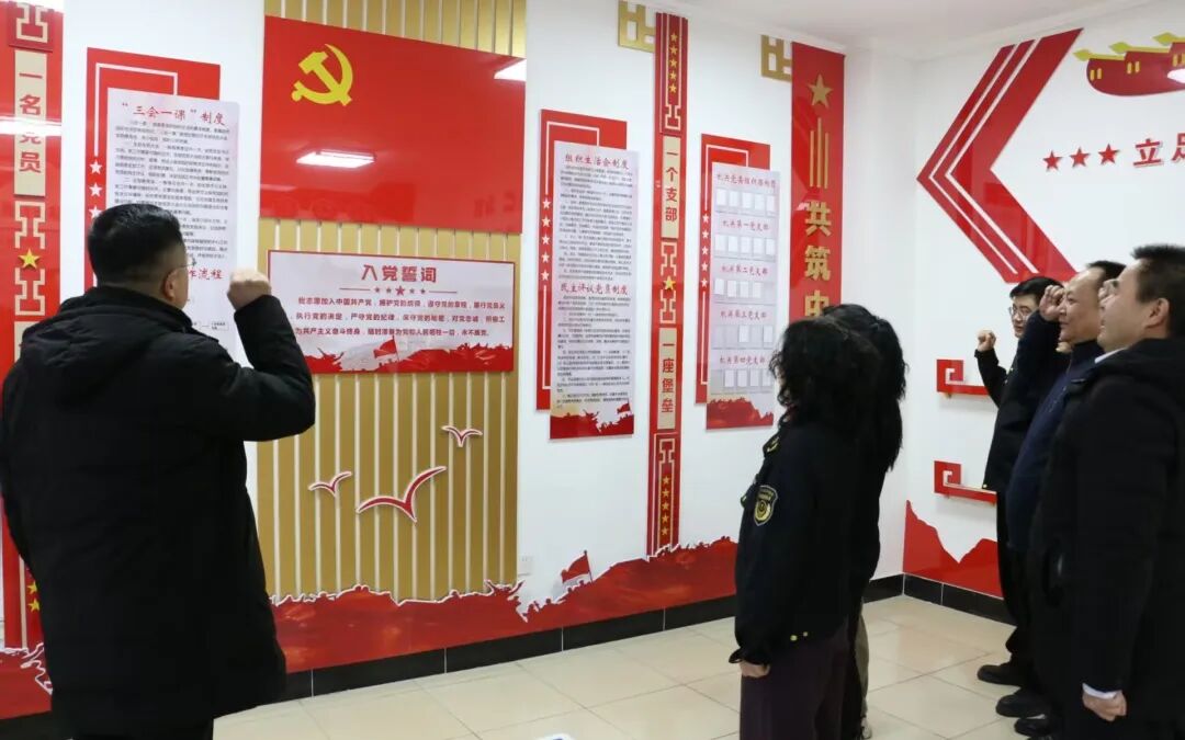 重温入党誓词,牢记初心使命。全体党员面向党旗庄严肃立,高举右拳在领誓人的带领下齐声重温入党誓词,铿锵誓言表达了全体党员对党的忠诚与担当,激发起党员干部在新时代发展新征程中锐意进取、踔厉奋发的昂扬斗志。