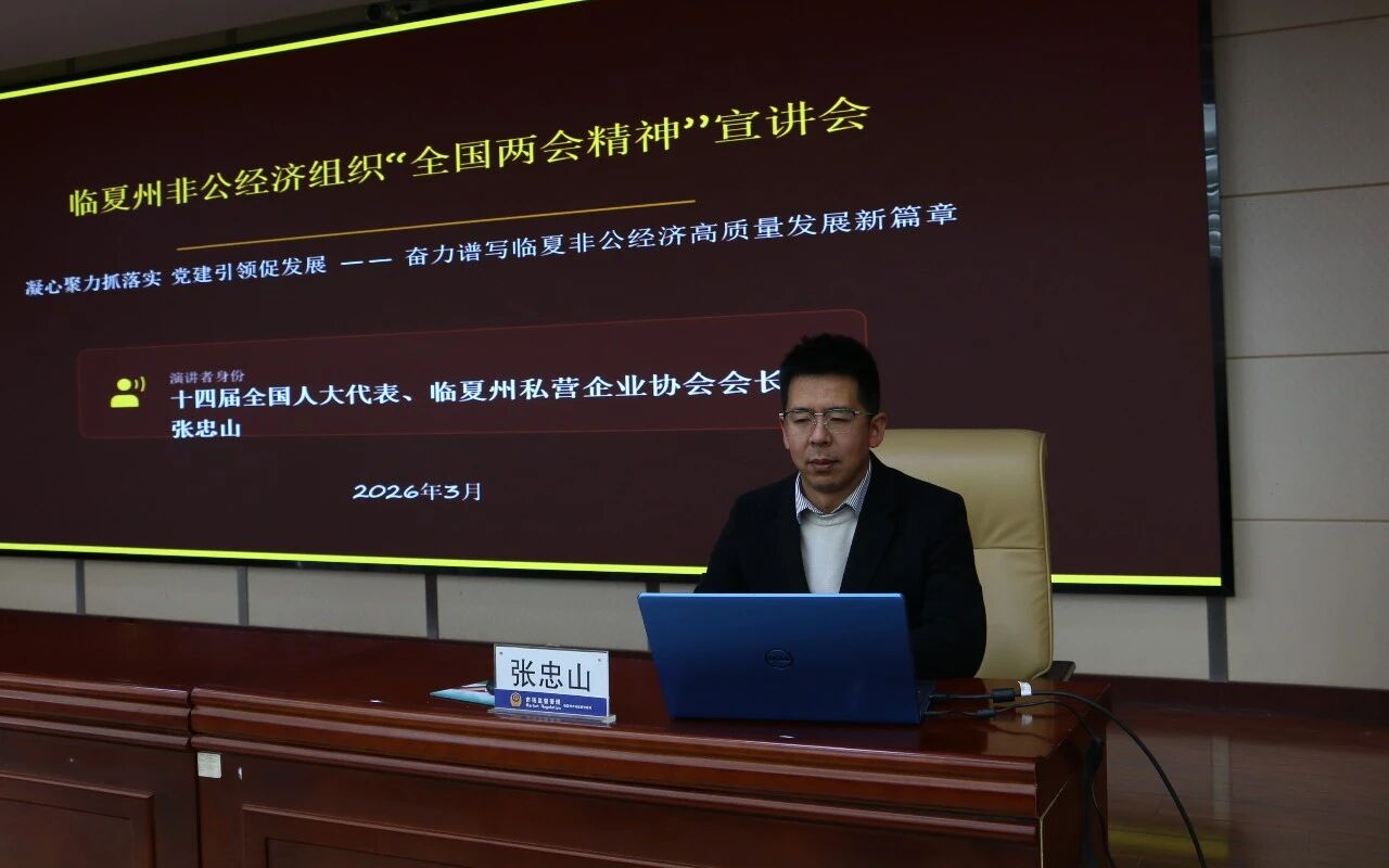 会议邀请十四届全国人大代表、州私营企业协会会长张忠山同志作专题宣讲报告。张忠山以《凝心聚力抓落实,党建引领促发展——奋力谱写临夏非公经济高质量发展新篇章》为主题,从大会基本概况、总书记重要讲话、报告及规划要点、甘肃代表团履职情况、政策红利与机遇、贯彻落实要求六个方面进行了宣讲,用生动的语言、鲜活的案例,深入解读了全国两会精神的核心要义和实践要求,既有政治高度,又有理论深度,更有实践温度,为深刻领会、准确把握全国两会精神提供了重要指引。