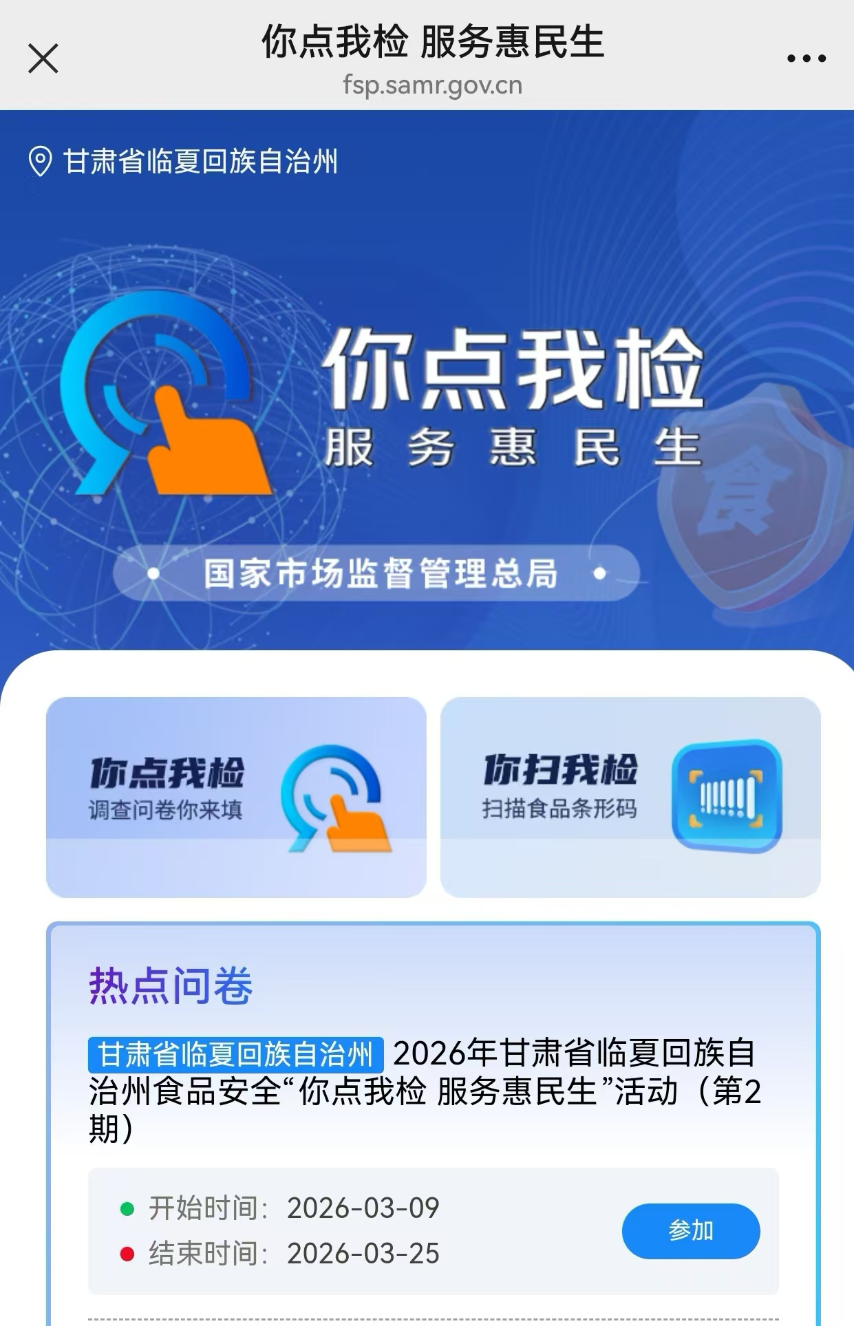 (2)定位在甘肃省临夏回族自治州的居民朋友选择【2026年甘肃省临夏回族自治州食品安全“你点我检 服务惠民生”活动(第2期)】,点击【参加】,即可参与本次问卷调查;