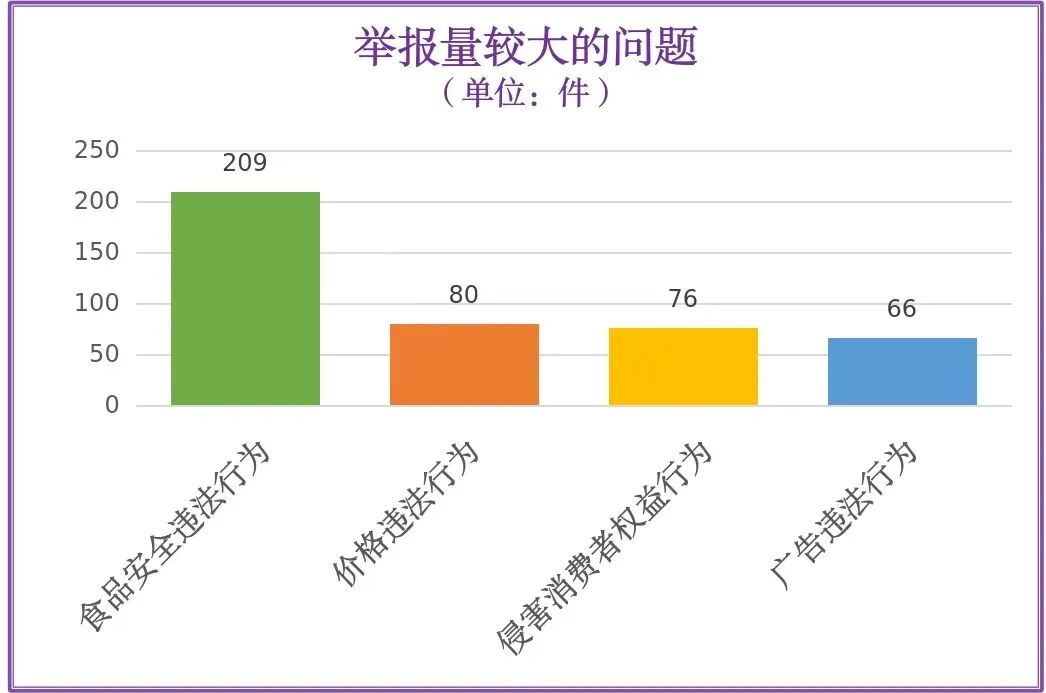 从举报问题来看,举报量较大的主要有:食品安全违法行为(209件)、价格违法行为(80件)、侵害消费者权益行为(76件)、广告违法行为(66件)
