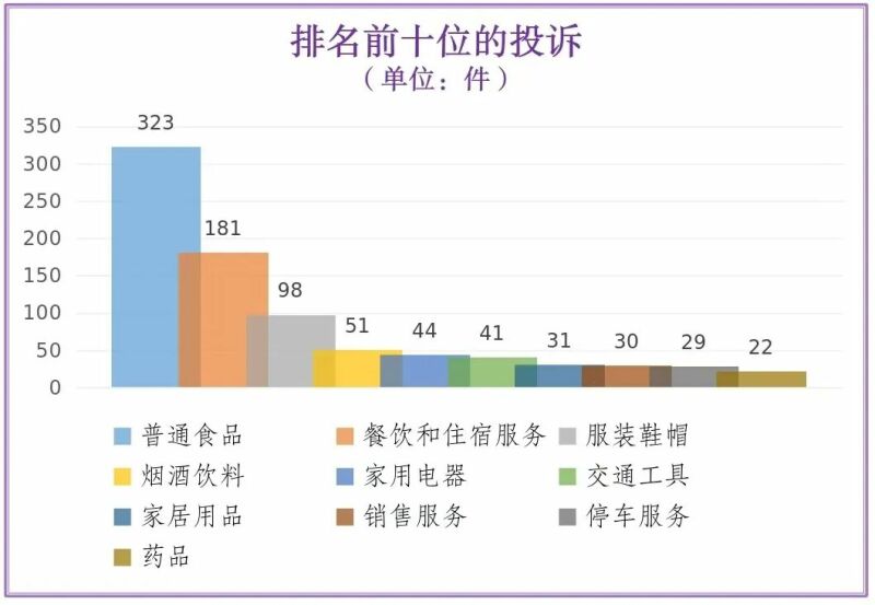 投诉量排名前十位的是:普通食品(323件)、餐饮和住宿服务(181件)、服装鞋帽(98件)、烟酒饮料(51件)、家用电器(44件)、交通工具(41件)、家居用品(31件)、销售服务(30件)、停车服务(29件)、药品(22件)。