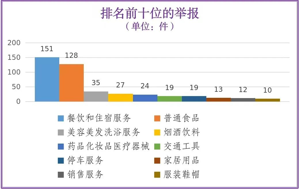 举报量排名前十位的是:餐饮和住宿服务(151件)、普通食品(128件)、美容美发洗浴服务(35件)、烟酒饮料(27件)、药品化妆品医疗器械(24件)、交通工具(19件)、停车服务(19件)、家居用品(13件)、销售服务(12件)、服装鞋帽(10件)。