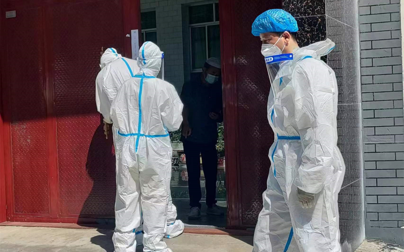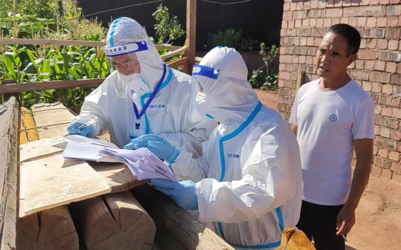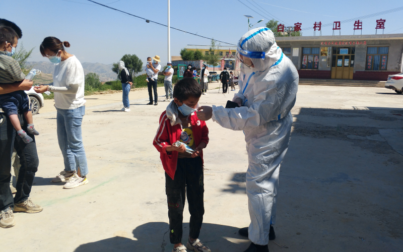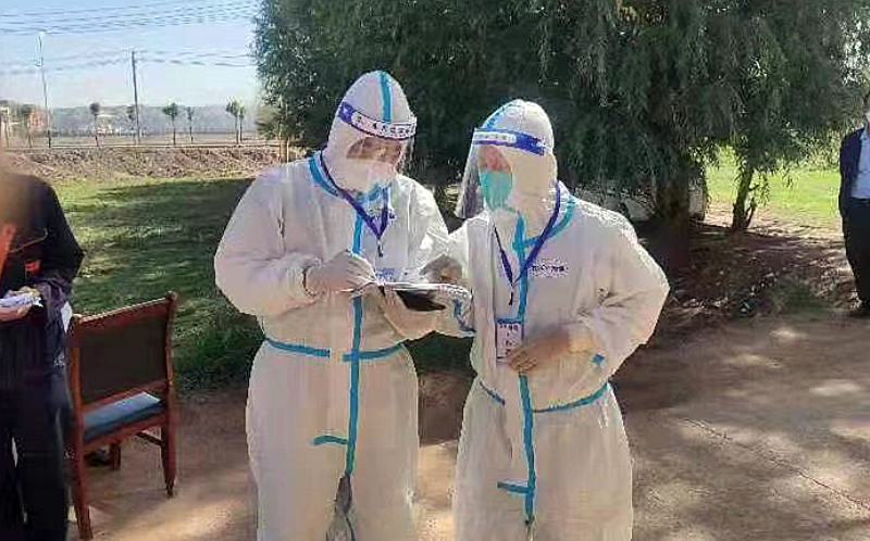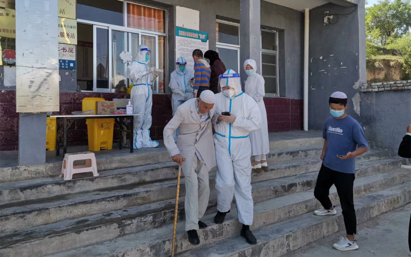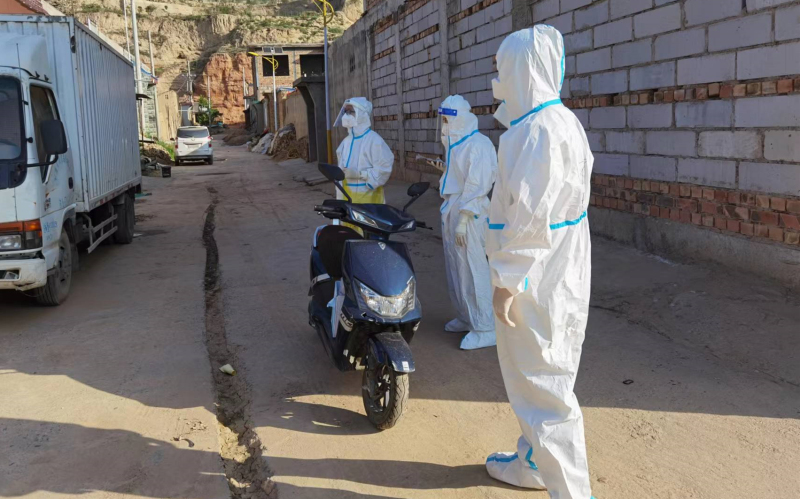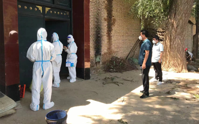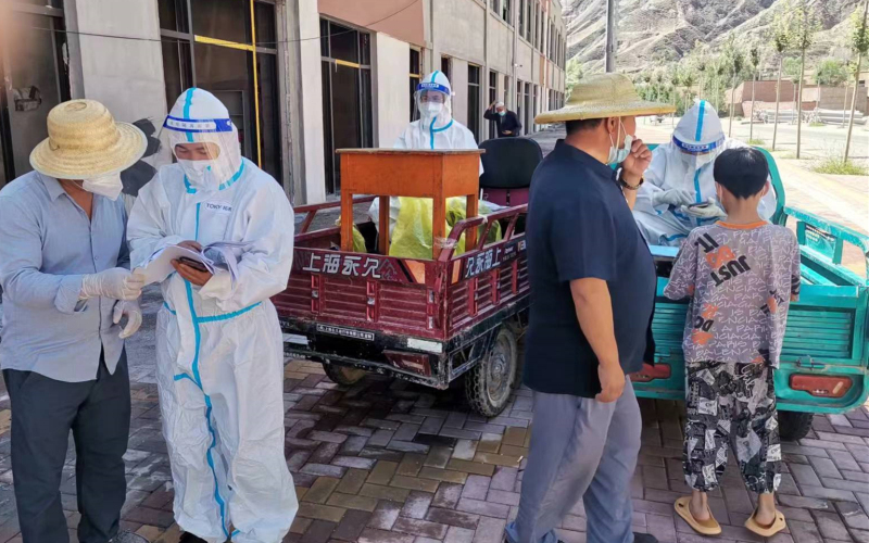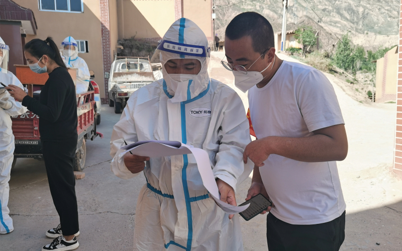 妥进鹏、魏晋伟、郭旭朝3名同志在东乡县达板镇拱北滩村配合村干部与医护人员深入各社与建筑工地开展全员核酸检测,对全村661户村民及外来人员核酸检测信息进行核实,配合开展静态管控和在家人员登记等工作。